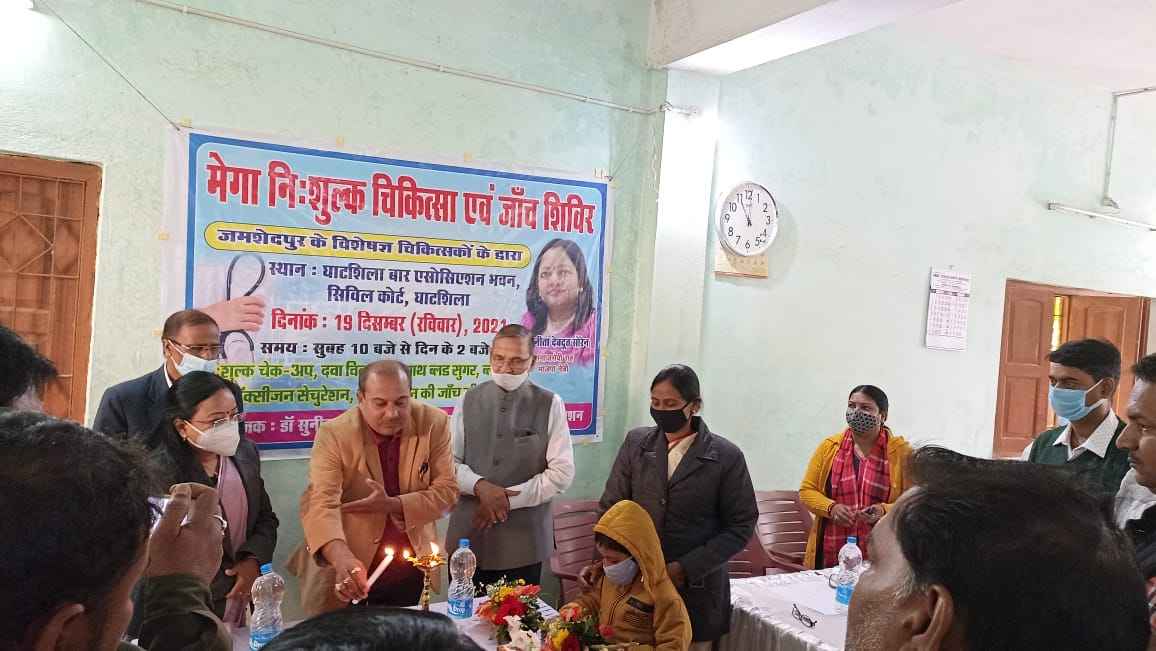 घाटशिला, घाटशिला विधानसभा क्षेत्र के चर्चित समाजसेवी सहा भाजपा नेत्री डॉ सुनीता देवदूत सोरेन के द्वारा एवं घाटशिला बार एसोसिएशन का सहयोग से एक विशाल मेगा हेल्थ कैंप का आयोजन किया गया था | जिसमें मुख्य रूप से ब्लड शुगर, हेमोग्लोबिन, ईसीजी, तथा नि:शुल्क में दवा वितरण किया गया। इसके अलावा जमशेदपुर के विख्यात संजीव नेत्रालय का भी सहयोग रहा जिसमें करीब 85 आंख के मरीज भी मिले, कुछ हाथ के मरीजों को ऑन स्पॉट सर्जरी के लिए जमशेदपुर पहुंचाया गया । इस शिविर में लगभग 276 मरीजों को मुफ्त में उनकी शारीरिक जांच एवं अन्य रोगों की जांच की गई इस शिविर में जमशेदपुर के करीब 10 विशेषज्ञ डॉक्टरों का भी सहयोग रहा। जिसमें विभिन्न क्षेत्र के डॉक्टर मौजूद रहे डॉक्टर कल्याण कुमार (कंसलटेंट एवं फिजीशियन डायबिटोलॉजी) डॉ रंजीत मुर्मू (जनरल फिजीशियन ) रामदु हाँसदा (ऑर्थोपेडिक सर्जन) डॉक्टर प्रीति सिंघानिया ( कार्डियोलॉजिस्ट) डॉक्टर देवदूत सोरेन (जनरल लेप्रोस्कोपी सर्जन )डॉक्टर अभिषेक मुंडू (चाइल्ड स्पेशलिस्ट) डॉक्टर दिवाकर कुमार (एमबीबीएस एमडी प्रोफेसर ऑफ एमजीएम कॉलेज) रानी बैक (गायनोकोलॉजिस्ट) एवं मुख्य सहयोगी डॉ सुनीता देवदूत सोरेन , (रेडियोलॉजिस्ट )के रूप में रही। इस मेगा हेल्थ कैंप में जमशेदपुर के कसेरा सेल्स के सीएमडी माननीय विनोद कसेरा जी भी मौजूद थे साथी हेल्प क्रॉस के अध्यक्ष बीके शर्मा जी भी महत्वपूर्ण योगदान दिए । इस कार्यक्रम के मुख्य अतिथि के रूप में घाटशिला कोर्ट के एडीजे के के शुक्ला सर, एसीजेएम सुशीला सोरेंग जी अनुमंडल पदाधिकारी सत्यवीर रजक सर ,एवं घाटशिला बार एसोसिएशन के सचिव मुखर्जी सर अधिवक्ता अजीत कुमार जी,अधिवक्ता बापी पाल जी, अधिवक्ता धीरेन पाल जी,अधिवक्ता धरणीधर महतो जी,एवं अन्य सम्मानित अधिवक्ता गण के साथ भाजपा के पूर्व जिला अध्यक्ष दिनेश साहू जी ,चंदन गिरी जी भी मौजूद रहे, एवं सक्रिय कार्यकर्ता के रूप में फार्मेसी में शत्रु भाई ,संतोष मुर्मू जी अन्य विभाग में संजीव भुंईया जी,अविनाश मिश्रा जी, निकिता जी, नीमा रजक जी ,किरण कुमार जी, विनय बेरा जी ,राकेश सिन्हा जी बापुण पाल जी ,अनिल पाल जी, दीपू दत्ता जी मदन टू डू इस कार्यक्रम के मुख्य सहयोगी के रुप में अपना बहुमूल्य सहयोग दिया।