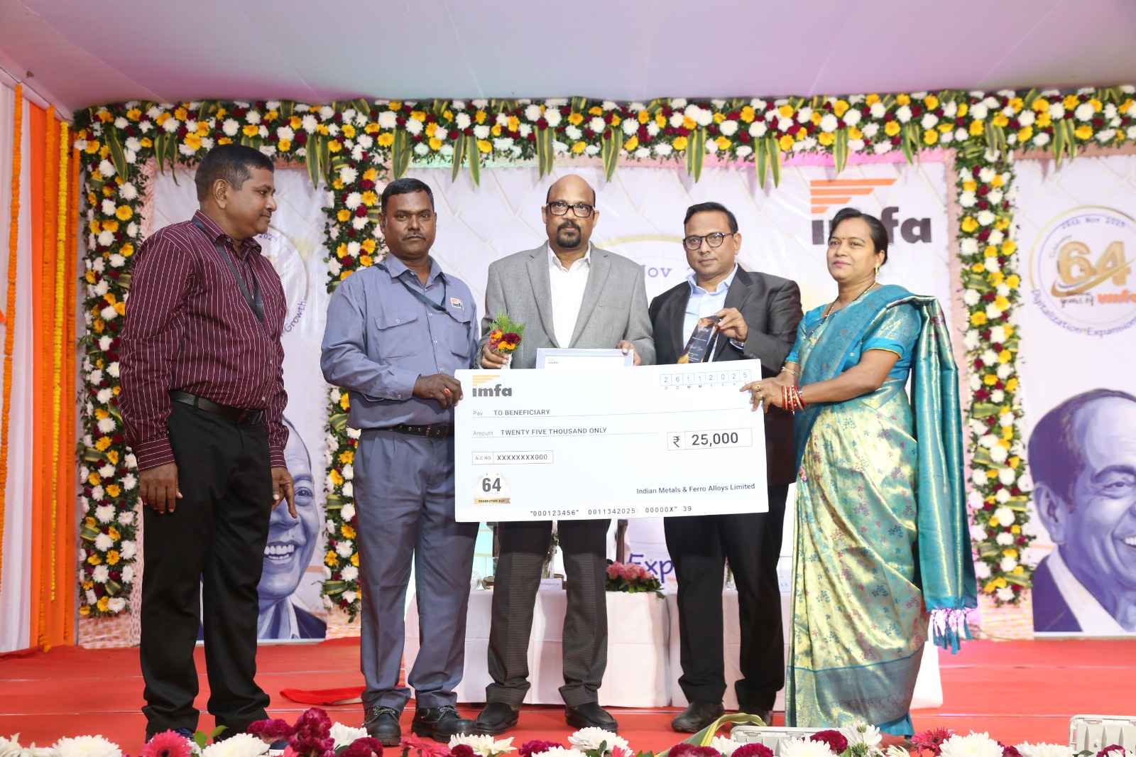 ସନ୍ଧ୍ୟା ଘ ୪. ୩୦ମି ସମୟରେ ଇମ୍ଫା କାରଖାନା ପରିସର ମଧ୍ୟରେ ୬୪ ତମ ପ୍ରତିଷ୍ଠା ଦିବସ ଆନୁଷ୍ଠାନିକ ଭାବେ ପାଳନ ହୋଇଥିଲା । ଏହି ସମାରୋହରେ ଦୀର୍ଘ କାଳୀନ ସେବା ପ୍ରଦାନ କରିଥିବା ୩୦ ଜଣ ଶ୍ରମିକ ଓ କର୍ମଚାରୀମାନଙ୍କୁ ଉପହାର ଓ ମାନପତ୍ର ଦେଇ ସମ୍ମାନିତ କରାଯିବା ସହ , ଆମ ଅଞ୍ଚଳ ବିଦ୍ୟାଲୟ ମାନଙ୍କରେ ଦଶମ ଶ୍ରେଣୀ ବୋର୍ଡ ପରୀକ୍ଷାରେ ସର୍ବୋଚ୍ଚନମ୍ବର ରଖି କୃତିତ୍ଵ ଅର୍ଜନ କରିଥିବା ୬ ଜଣ ଛାତ୍ର ଛାତ୍ରୀ ମାନଙ୍କୁ ଶିକ୍ଷାବୃତ୍ତି ପ୍ରଦାନ କରାଯାଇଥିଲା । ଇମ୍ଫାର ୬୪ ତମ ପ୍ରତିଷ୍ଠା ଦିବସ ଉପଲକ୍ଷେ ଅନ୍ତଃବିଭାଗୀୟ କୁଞ୍ଜବିହାରୀ ଭଲିବଲ ଟୁର୍ଣ୍ଣାମେଣ୍ଟ ଆୟୋଜିତ ହୋଇଥିଲା । ଏଥିରେ ବିଜେତା ପ୍ରଥମ ସ୍ଥାନ ଓ ଦ୍ଵିତୀୟ ସ୍ଥାନ ପାଇଥିବା ଦୁଇ ଦଳକୁ ପୁରସ୍କୃତ କରାଯାଇଥିଲା । କାରଖାନା ପରିସରରେ ଆୟୋଜିତ ଏହି କାର୍ଯ୍ୟକ୍ରମରେ ଇମ୍ଫା ଶିଳ୍ପ ଗୋଷ୍ଠୀର ପୂର୍ଣ୍ଣକାଳୀନ ନିର୍ଦ୍ଦେଶକ -ତଥା-ମୁଖ୍ୟ ନିର୍ବାହୀ ଅଧିକାରୀ ଶ୍ରୀମାନ ବିଚିତ୍ରାନନ୍ଦ ମହାପାତ୍ର ,ମୁଖ୍ୟ ଅତିଥିଭାବେ ,ବ୍ୟବସାୟିକ ମୁଖ୍ୟ ଶ୍ରୀମାନ ସୁରେଶ ବାବୁ ସମ୍ମାନିତ ଅତିଥି ଭାବେ ଯୋଗଦେଇଥିଲେ ଶ୍ରୀମାନ କ୍ଷିତିଶ ଚନ୍ଦ୍ର ମହାପାତ୍ର , ଉପମୁଖ୍ୟ ପରିଚାଳକ (ମାନବସମ୍ବଲ ଓ ପ୍ରଶାଶନ ) କାର୍ଯ୍ୟକ୍ରମକୁ ପରିଚାଳନନା କରିବା ସହ ସ୍ଵାଗତ ଅଭିଭାଷଣ ଓ ଧାନ୍ୟବାଦାର୍ପଣ କରିଥିଲେ । ଇମ୍ଫାର ଶ୍ରମିକ , କର୍ମଚାରୀ , ବିଭିର୍ଣ୍ଣ ବିଭାଗର ଅଧିକାରୀ ଓ ସେମାନଙ୍କର ପରିବାର ବର୍ଗ ଉପସ୍ଥିତ ରହି ପୁରସ୍କୃତ ହୋଇଥିବା ସମସ୍ତ ବ୍ୟକ୍ତି ମାନଙ୍କୁ ଉତ୍ସାହିତ କରିଥିଲେ । କାର୍ମିକ, ଲୋକ ସମ୍ପର୍କ ଓ ସାଧାରଣ ପ୍ରଶାସନ ବିଭାଗର କର୍ମକର୍ତ୍ତା ମାନେ ଏହି କାର୍ଯ୍ୟକ୍ରମ ପରିଚାଳନାରେ ସହଯୋଗ କରିଥିଲେ । ପରିଶେଷରେ ଉପସ୍ଥିତ ସମସ୍ତ ବ୍ୟକ୍ତିଙ୍କୁ ଜଳଯୋଗରେ ଆପ୍ୟାୟିତ କରାଯାଇଥିଲା । ରାୟଗଡ ରୁ ଆସିଥିବା ସ୍ଵର ସାଗର ସାଂସ୍କୃତିକ ଦଳ ତରଫରୁ ଅତି ସୁନ୍ଦର ଭାବେ ଚିତ୍ତାକର୍ଷକ ମନୋରଂଜନ କାର୍ଯ୍ୟକ୍ରମ ଅନୁଷ୍ଠିତ ହୋଇଥିଲା । ଆଜିର ଦିନଟି ଇମ୍ଫାର ପ୍ରତିଟି ଶ୍ରମିକ ଓ କର୍ମଚାରୀମାନଙ୍କ ମଧ୍ୟରେ ଏକ ଉତ୍ସାହ , ଉଦ୍ଦୀପନା ଓ ନୂତନ ଗର୍ବର ଅନୁଭବ ପ୍ରଦାନ କରିଥିଲା।